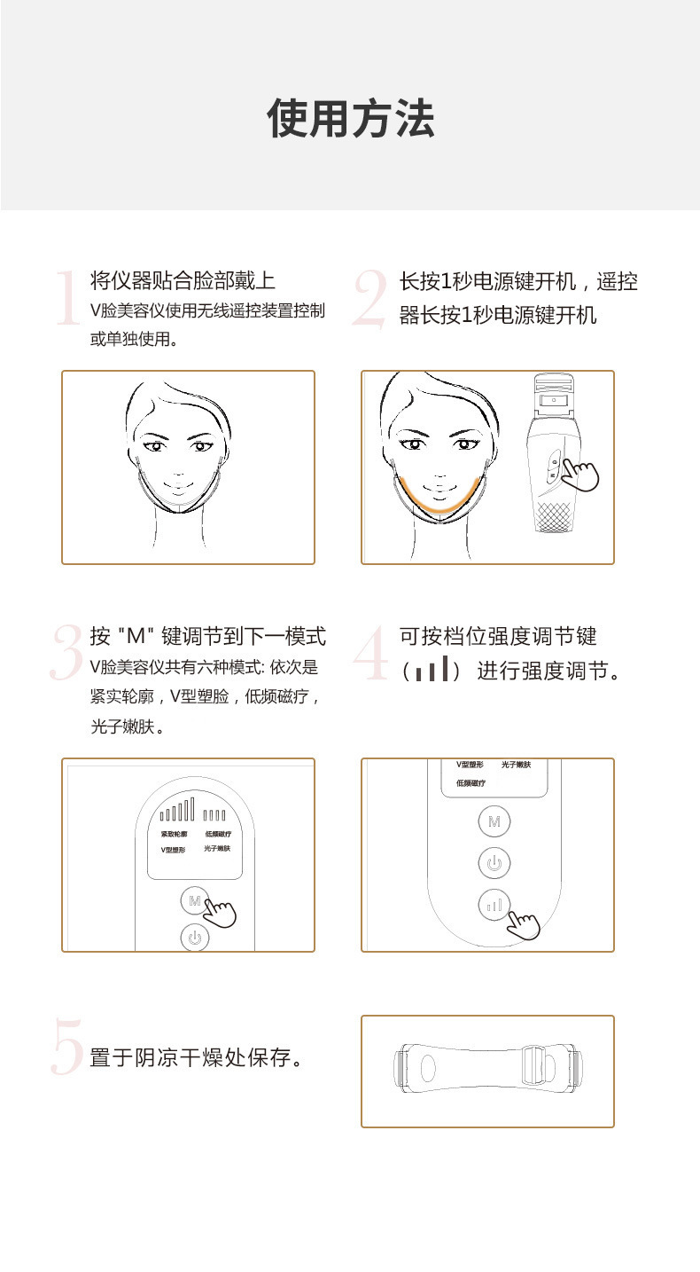 调节头带,戴在下巴位置,使面贴合产品的V型,开关键长按3秒开机,短按选择模式,默认档位1。短按+/-按调节力度,1-8档可调节。长按开关键关机。