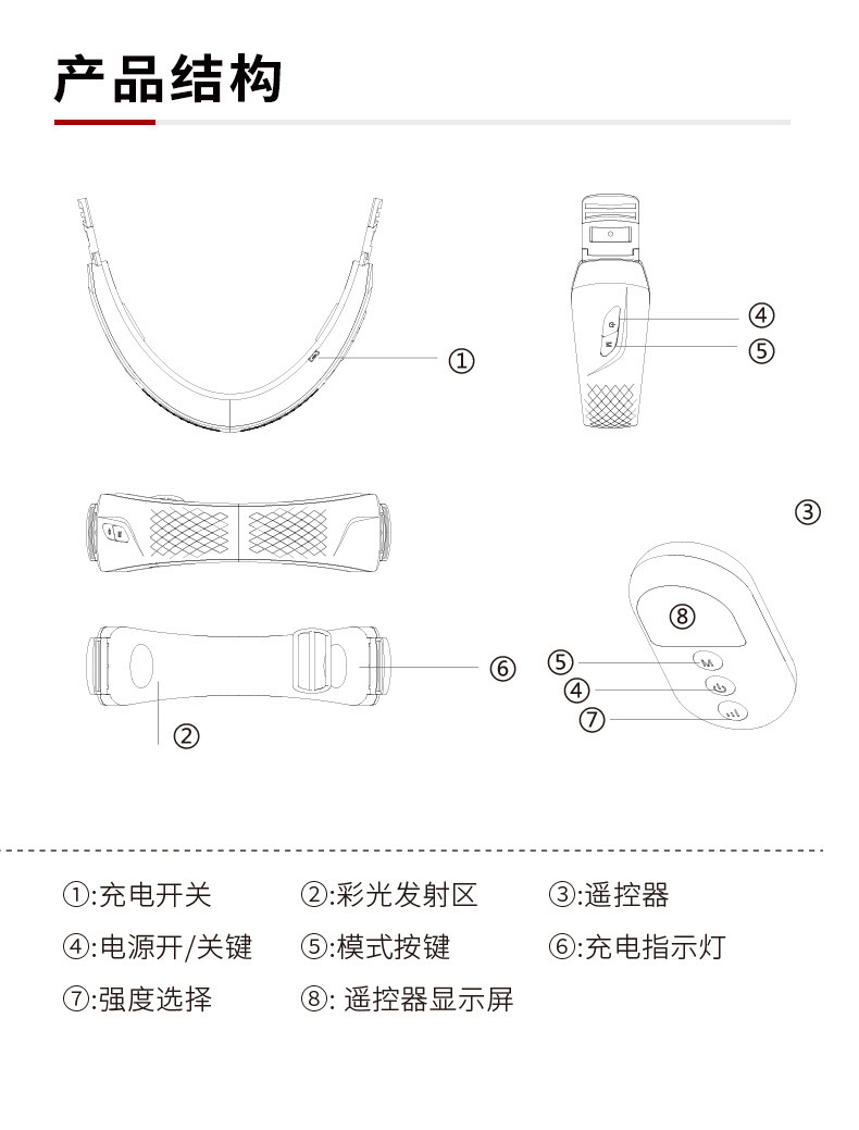包装清单:瘦脸仪*1,遥控器*1,type-C充电线*1,弹力带*1,脉冲贴片*1对,1.2M线*1,说明书*1